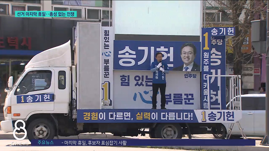 더불어민주당 송기헌 후보는 유세차에 올라 8년 국회의원을 강조했습니다.