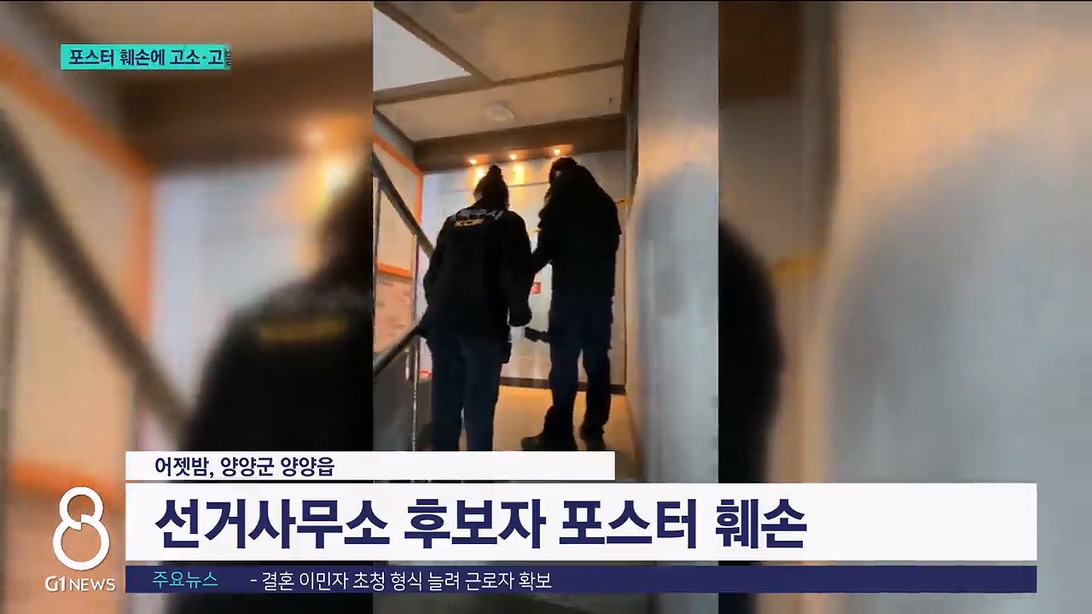 "선거사무소 문을 발로 막 차면서 나오라고 욕을 하고 그러면서..조금 이따 내려와 보니까 (포스터) 상태가 이렇게 돼 있어서 신고했죠."