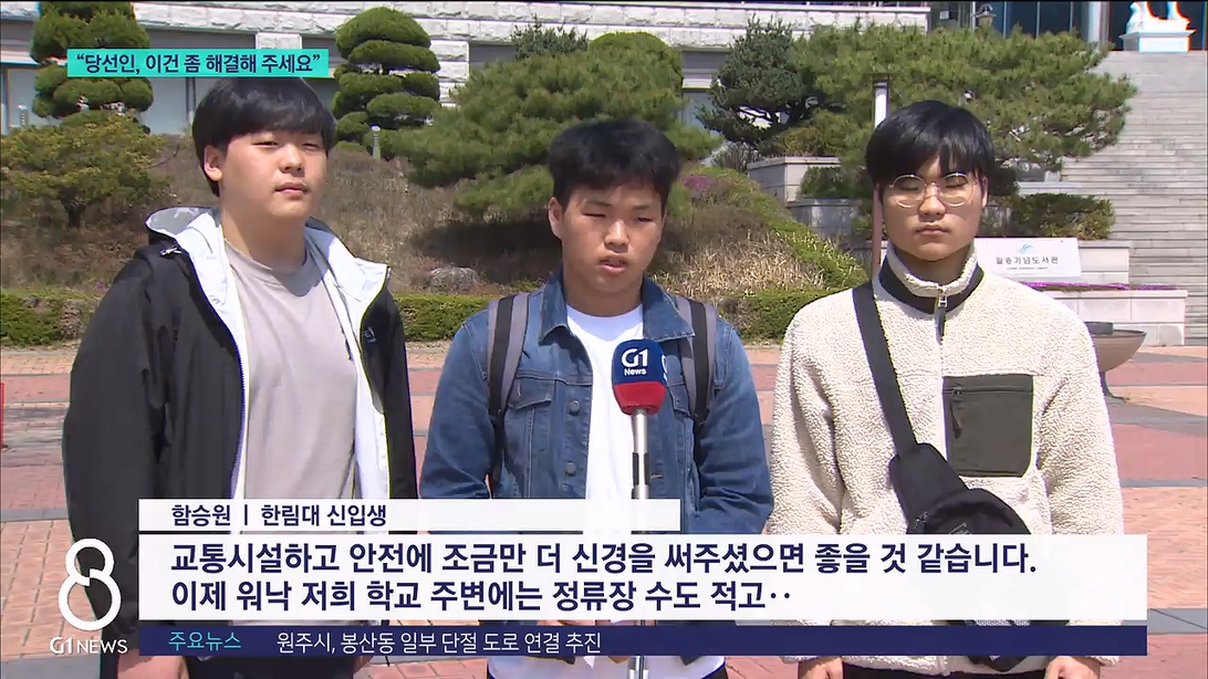 "교통시설하고 안전에 조금만 더 신경을 써주셨으면 좋을 것 같습니다. 이제 워낙 저희 학교 주변에는 정류장 수도 적고.."