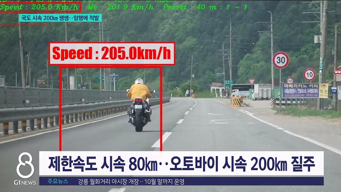 제한속도 시속 80km인 국도에서 200km가 넘게 질주하던 오토바이 운전자가 암행순찰팀에 적발됐습니다.