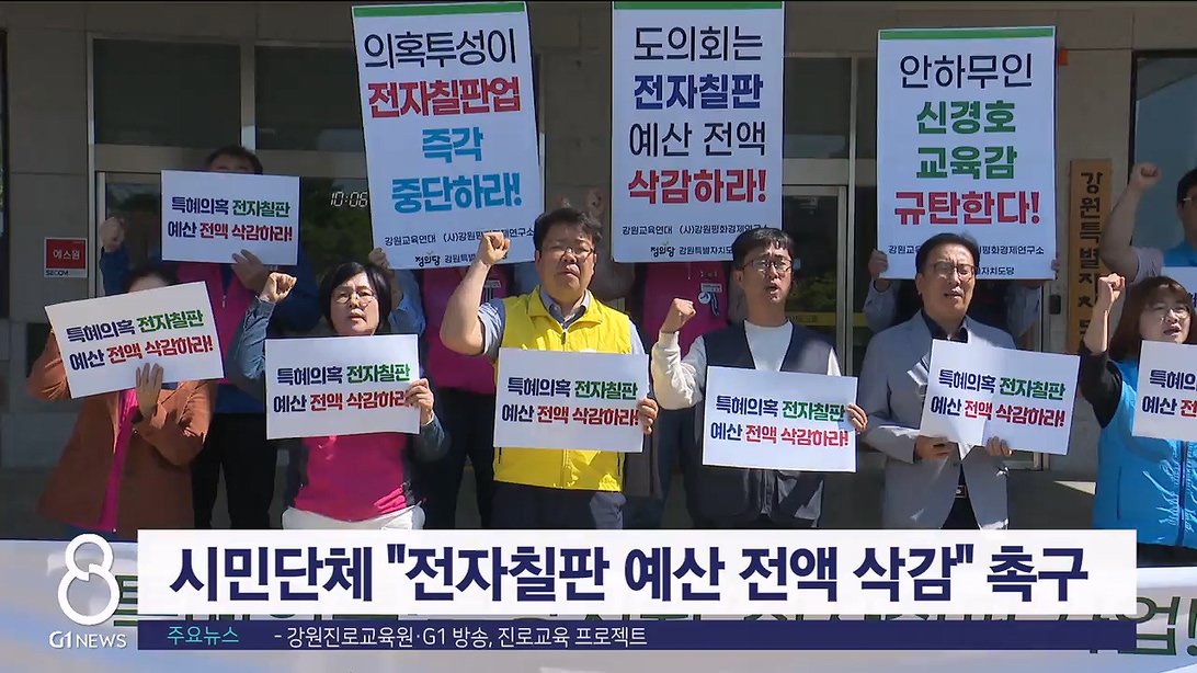 강원자치도교육청이 재추진하고 있는 전자칠판 보급 사업과 관련해, 도내 시민단체가 오늘(13일) 도의회 앞에서 기자회견을 열고 예산 전액 삭감을 촉구했습니다.