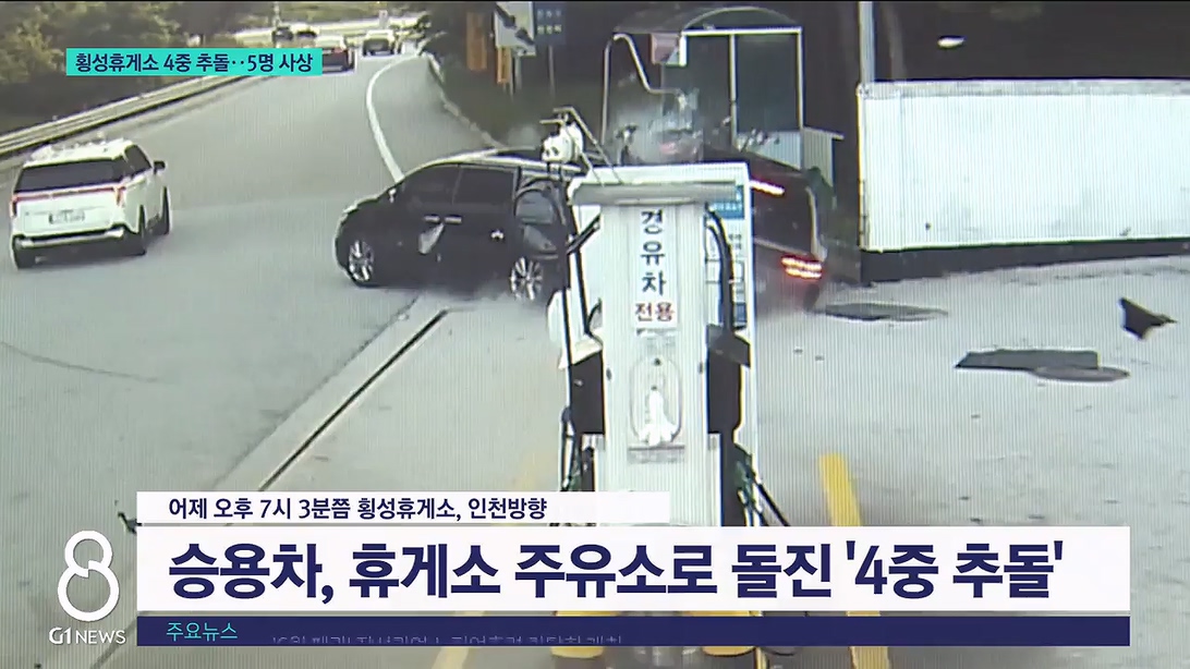 어제(18일) 저녁 횡성휴게소 내 주유소에서 4중 추돌사고가 났습니다.