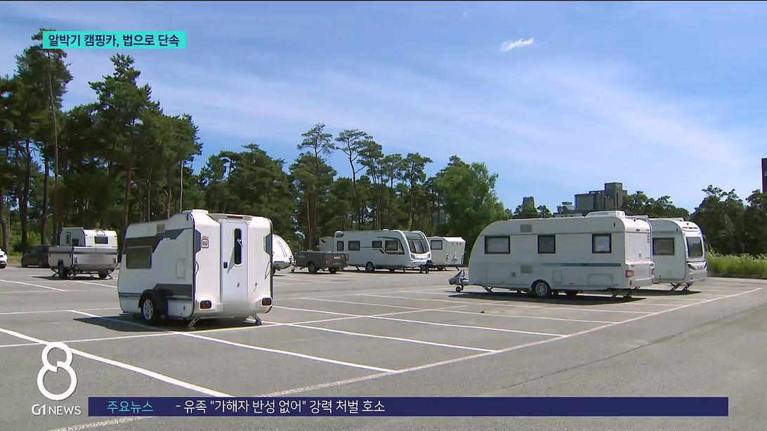 "주차장법 개정을 발판으로 알박기 캠핑차량에 대한 대대적인 단속이 실효성 있는 성과를 거두기 위해서는 소유주들의 의식 개선도 동반되어야 할 것으로 보입니다. G1뉴스 김기태입니다."