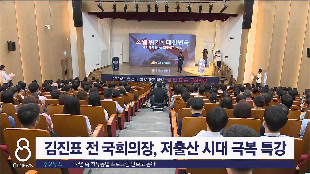 김진표 전 국회의장이 오늘(5일) 춘천시청에서 '소멸 위기의 대한민국, 국회가 제안하는 인구문제 해법'을 주제로 특강을 했습니다.