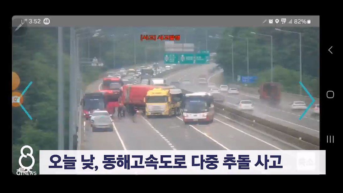 오늘 오후 3시 40분쯤 동해고속도로 속초 방향 강릉 분기점 인근에서 빗길을 달리던 화물차와 버스 등 다중 추돌 사고가 났습니다.