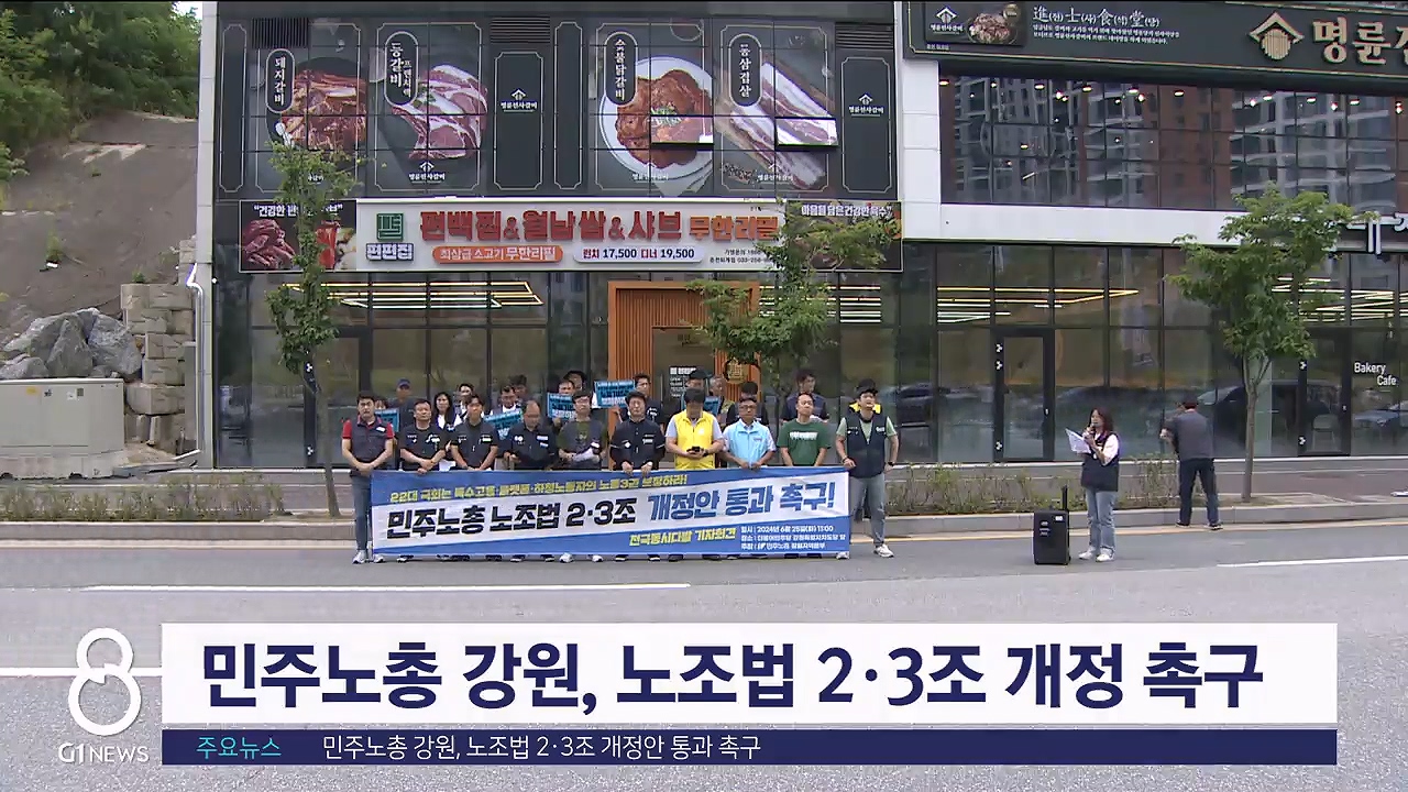 민주노총 강원지역본부가 오늘(25일) 더불어민주당 도당 앞에서 '노란봉투법'으로 알려진 노조법 2, 3조 개정안 통과를 촉구했습니다.