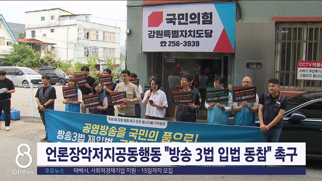 전국 92개 시민사회노동단체로 구성된 언론장악저지공동행동은 오늘(1일) 국민의힘 강원자치도당 앞에서 기자회견을 열고, '방송 3법 입법 동참'을 촉구했습니다.