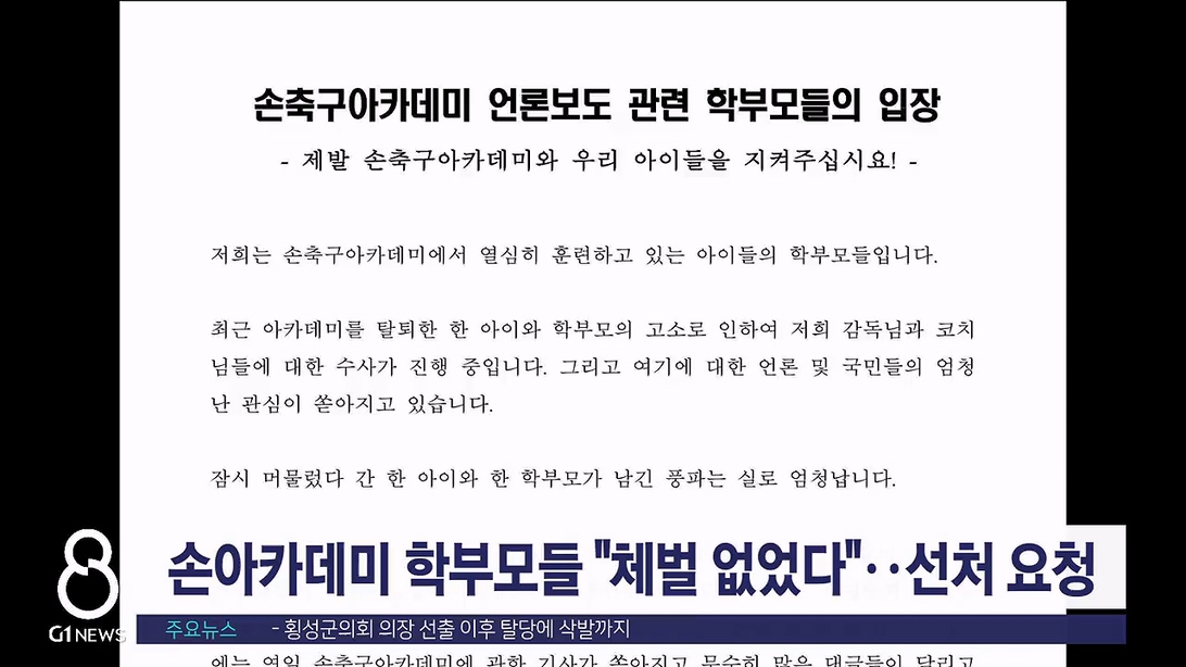 'SON축구아카데미' 학부모들은 입장문을 내고 "수년간을 아카데미에서 보냈지만 지금껏 단 한 번도 체벌이라는 것은 없었다"고 주장했습니다.