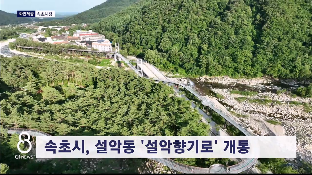 설악동 재건사업 일환으로 백억 원을 들여 조성된 설악향기로는 설악산을 조망할 수 있는 팔미터 높이의 스카이워크와 구십팔 미터의 출렁다리, 소공원과 산책로 등을 갖췄습니다.