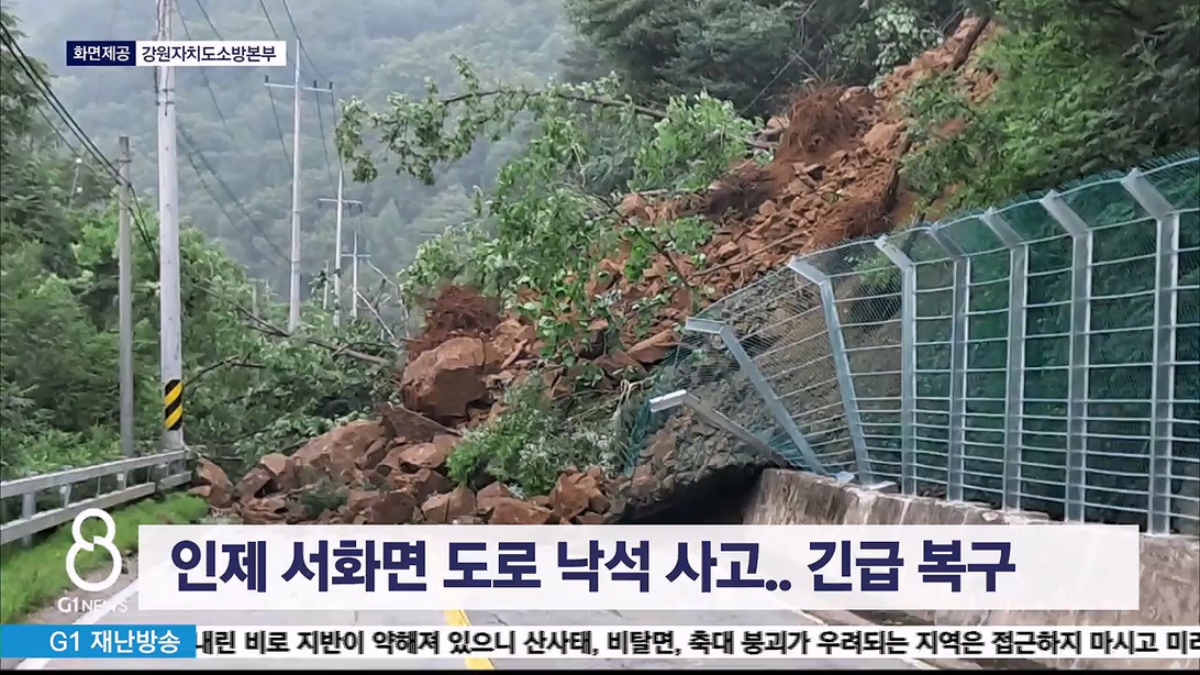 인제군은 최근 폭우로 지반이 약해지면서 이백 톤이 넘는 낙석이 발생한 것으로 보고, 중장비를 동원해 긴급 복구에 나섰습니다.