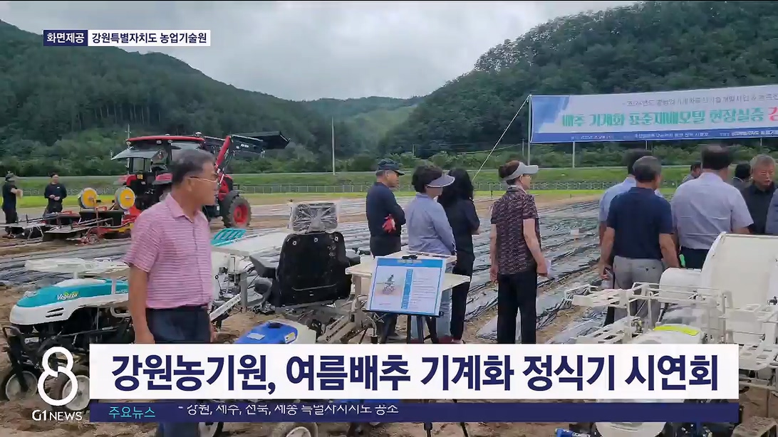강원자치도 농업기술원이 오늘(24일) 평창군 진부면에서 여름배추 기계화 확산을 위한 정식기 시연회를 열였습니다.