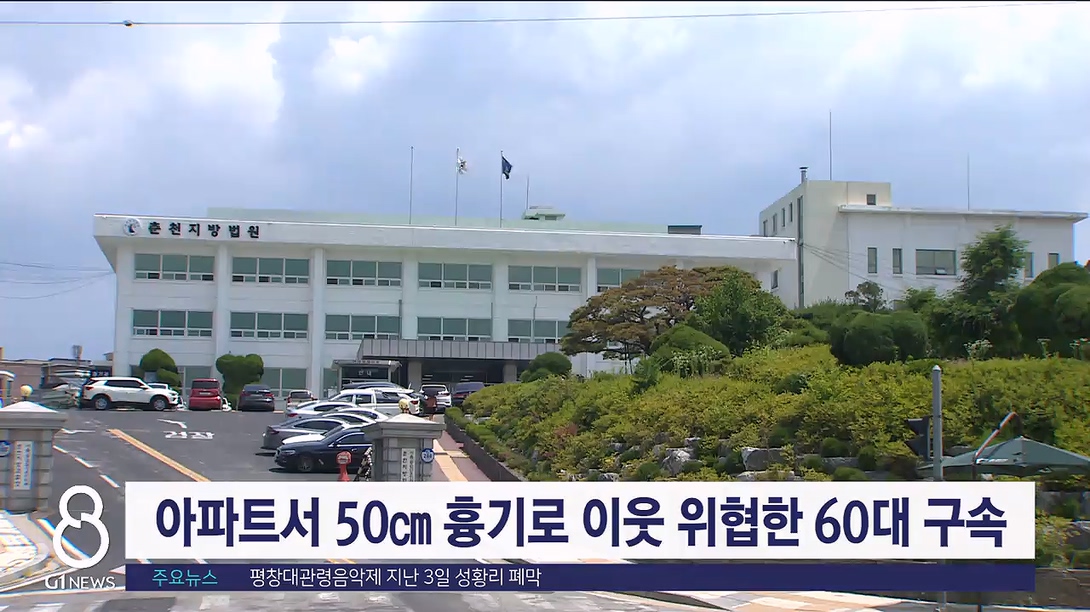A씨는 지난달 31일 오전 8시 39분쯤 춘천시 후평동의 한 아파트 쉼터에서 이웃 주민 70대 B씨에게 길이 50㎝에 달하는 흉기를 휘둘러 위협한 혐의를 받고 있습니다.