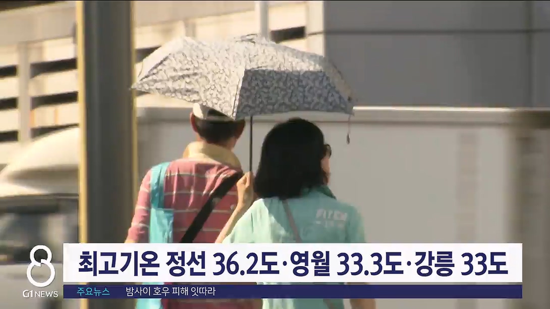오늘 최고기온은 정선 36.2도, 영월 33.3도, 삼척 신기와 강릉이 각각 33도 등을 기록했습니다.