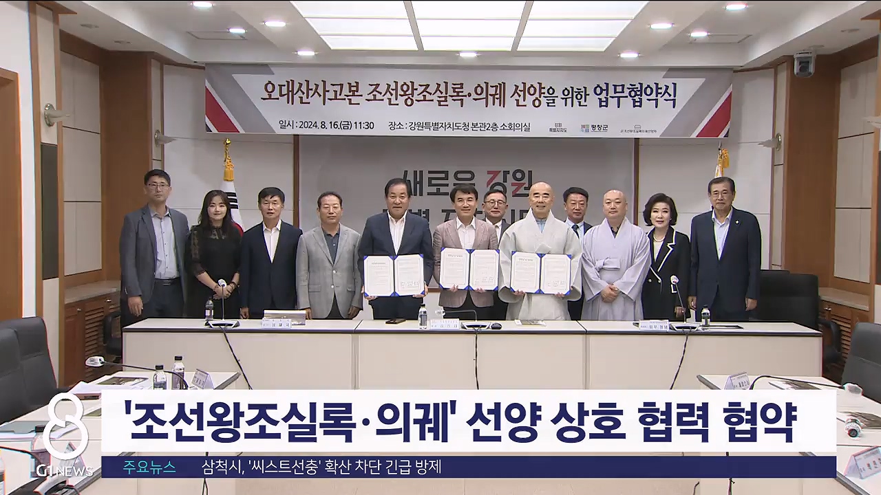 강원자치도와 평창군, 조선왕조실록·의궤선양회는 오늘(16일) 도청에서 '오대산사고본 조선왕조실록·의궤 선양, 협력을 위한 업무협약'을 체결했습니다.