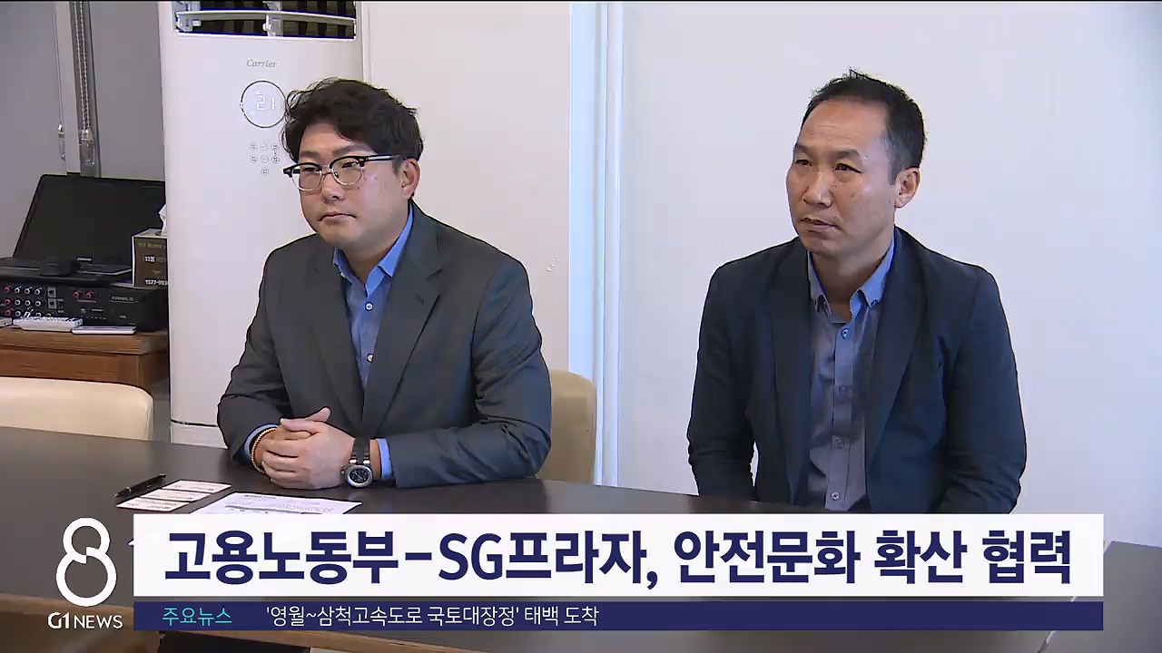 고용노동부 원주지청과 주식회사 SG프라자가 안전문화 확산과 실천을 위한 업무협약을 맺었습니다.