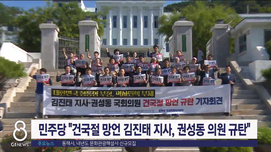 민주당 도당은 "김진태 지사와 권성동 의원은 대한민국의 정통성을 부정하고 역사인식의 부재를 보여줬다"며,