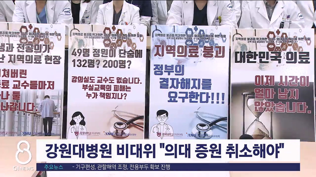강원대학교 의과대학 병원 교수 비상대책위원회는 오늘(12일) 강원대병원 어린이병원에서 기자 간담회를 열고 정부에 내년도 의대 증원 취소를 요구했습니다.