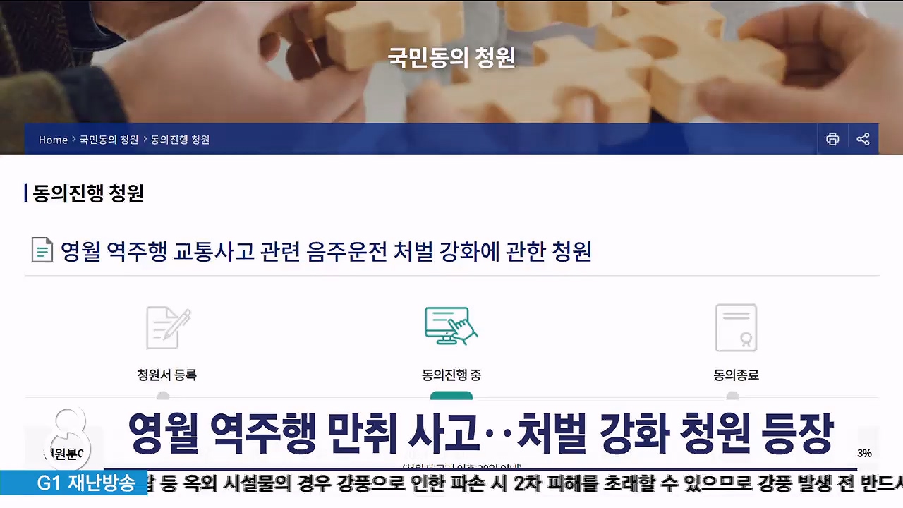 지난달 30일 국회 국민동의 청원에는 '영월 역주행 교통사고 관련 음주운전 처벌 강화에 관한 청원'이 게시됐습니다.