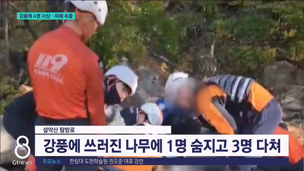 오늘(23일) 오전 8시 40분쯤 설악산 신흥사에서 울산바위를 가는 길목에 있던 나무가 강풍에 쓰러지며 등산객 4명을 덮쳤습니다.