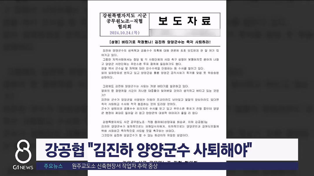 강공협은 성명서를 통해 김진하 양양군수의 성폭력과 금품수수 의혹이 일파만파 커지고 있지만, 김 군수가 사퇴는 커녕 버티기로 일관하고 있다고 밝혔습니다.