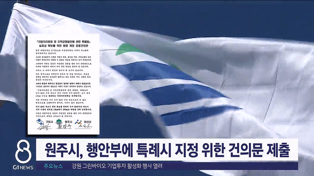 원주시는 충남 아산시, 경북 구미시와 함께 행안부에 '지방분권균형발전법' 개정을 위한 공동 건의문을 냈습니다.