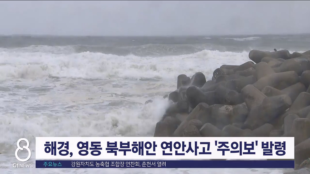 속초해경은 고성·속초·양양 연안 해역에 내일부터(26일) 다음 달 1일까지 연안 사고 위험예보 '주의보'를 발령했습니다.