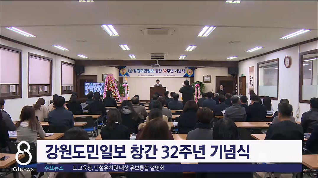 강원도민일보 창간 32주년 기념식이 김중석 회장을 비롯한 임직원들이 참석한 가운데 오늘(26일) 춘천 본사 대회의실에서 열렸습니다.