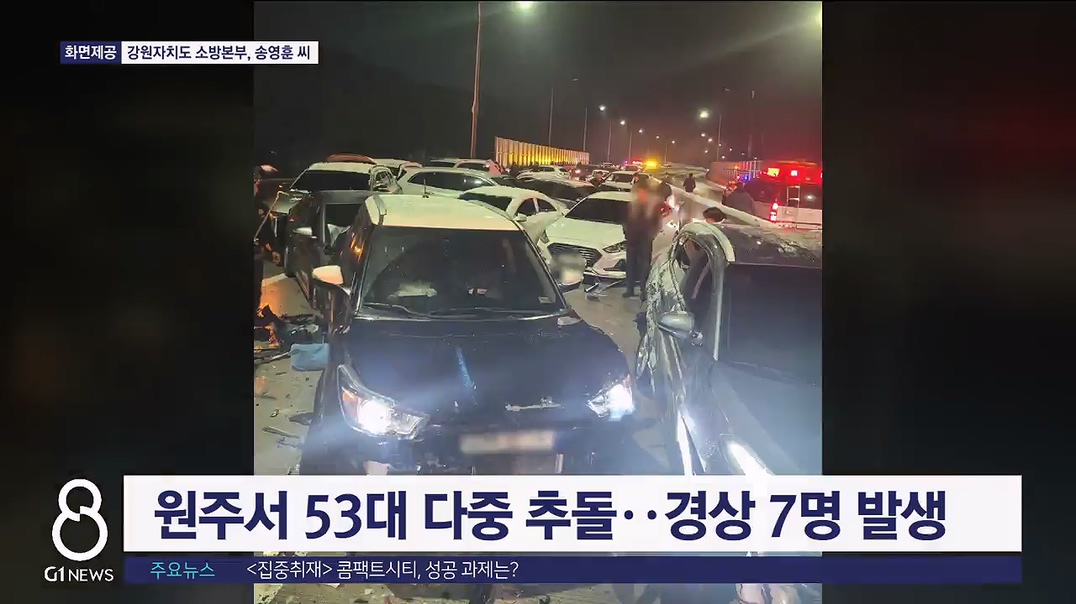 오늘 오후 5시 49분쯤 원주시 호저면 지방도 409호선 만종사거리에서 다중 추돌 사고가 발생했습니다.