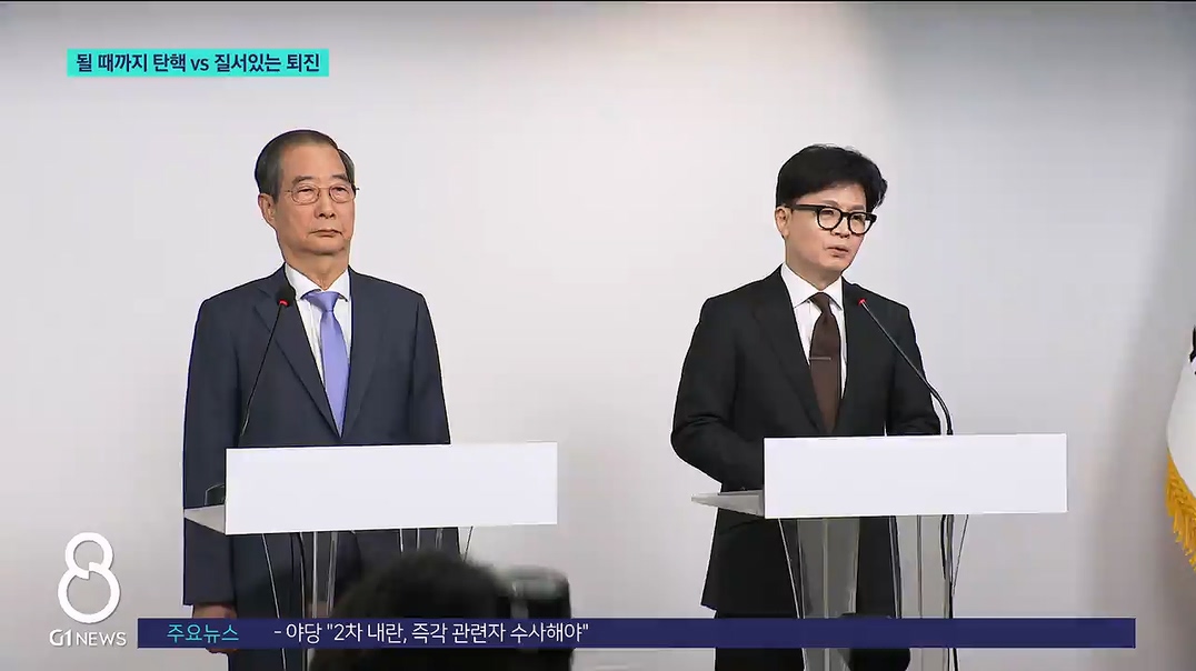 한덕수 국무총리는 국민의힘 중앙당사에서 한동훈 대표에 뒤이어 수습 방향을 발표했습니다.