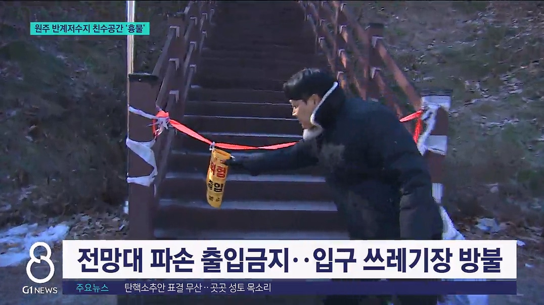 저수지를 내려다 볼 수 있는 전망대도 일부 파손 돼 출입이 금지됐고, 입구엔 버려진 이불도 보입니다.