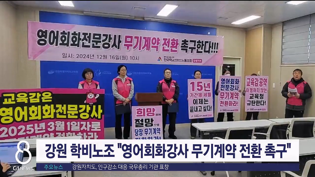 전국학교비정규직노동조합 강원지부는 오늘(16일) 도교육청에서 기자회견을 열고, "교육감 공약 사업인 영어회화 전문강사 무기계약직 전환을 이행하라"고 주장했습니다.