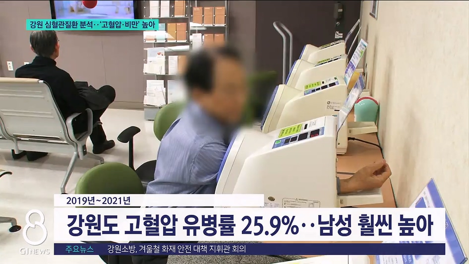 지난 2019년부터 2021년까지 전국 고혈압 유병률은 22.2%이지만, 강원도는 25.9%입니다.