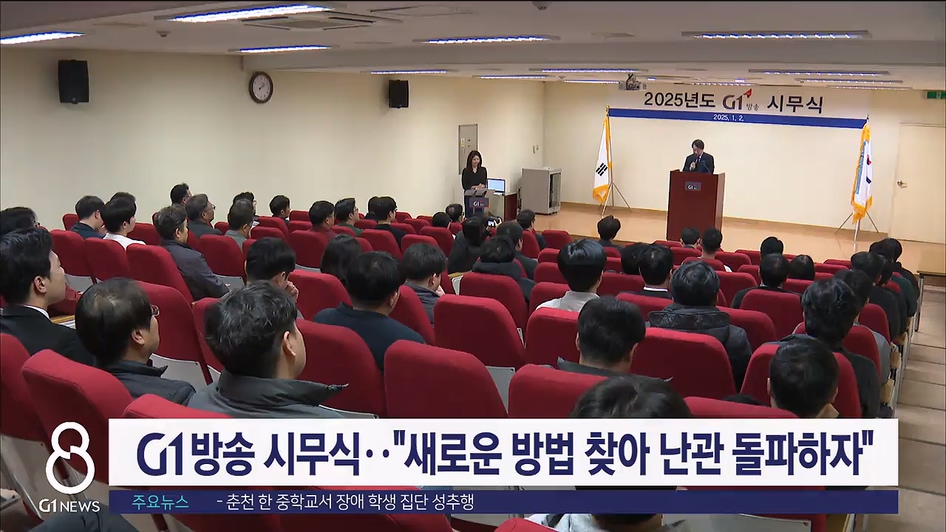 G1방송 2025년 시무식이 오늘(2일) 전종률 대표를 비롯한 임직원들이 참석한 가운데 G1 대강당에서 열렸습니다.