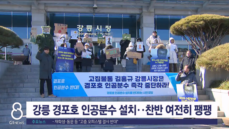 강릉 경포호 인공분수 설치를 둘러싼 찬반 논쟁이 여전히 이어지고 있습니다.