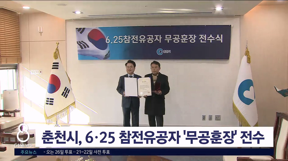 육동한 춘천시장은 오늘(3일) 시청에서 6·25 참전유공자인 고 이영호 상병의 조카 이승찬 씨에게 화랑무공훈장을 전달했습니다.