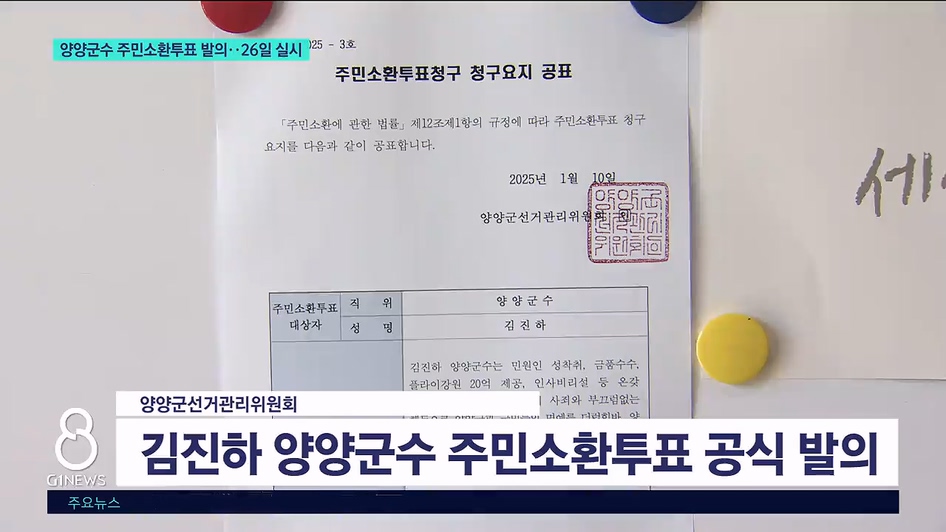 앞서 지난해 10월, 양양지역 시민사회단체는 김 군수에 대한 주민소환제를 청구했고, 당사자 소명서 제출 절차 등을 거쳤습니다.