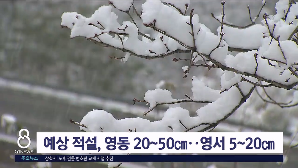 내일까지 예상 적설량은 영동지역 20에서 50cm, 영서지역은 5에서 20cm로 내다봤습니다.