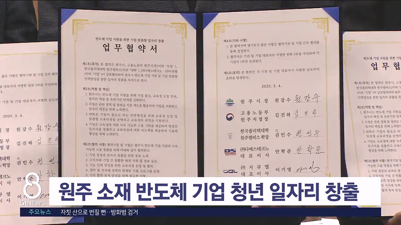 원주시는 오늘(4일) 시청 투자상담실에서 반도체 기업과 한국폴리텍대학 원주캠퍼스, 고용노동부 원주지청과 반도체 기업 맞춤형 일자리 창출을 위한 업무 협약을 맺었습니다.