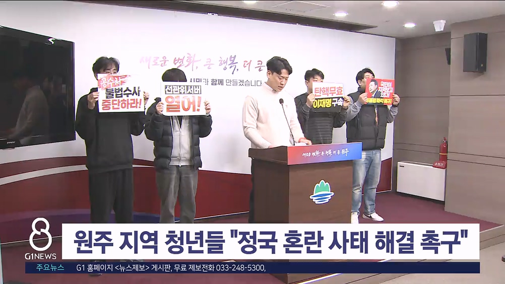 원주를 지키는 청년회는 오늘(6일) 시청 브리핑룸에서 기자회견을 열고 "행정부가 마비되고 사법부마저 흔들리는 현실 속에서 더 이상 청년들이 침묵할 수 없다"며 "대통령 탄핵을 반대한다"고 밝혔습니다.