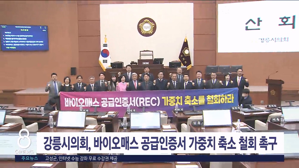 강릉시의회는 '제320회 임시회 2차 본회의'에서 성명서를 발표하고, '정부의 바이오매스 발전소 공급인증서 가중치 축소 방침은 지역 경제를 심각하게 위협할 것'이라고 지적했습니다.