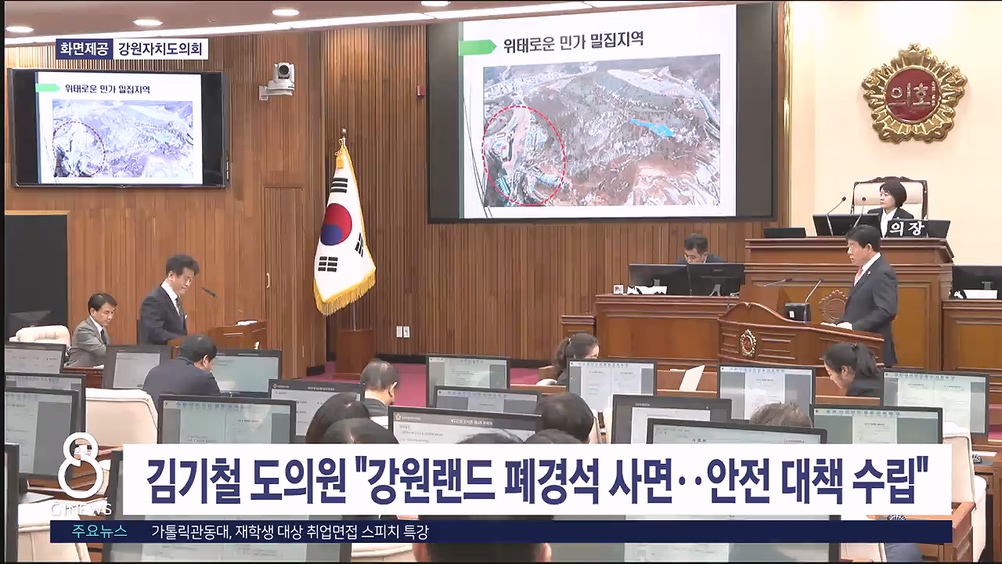 강원자치도의회 김기철 도의원은 오늘(13일) 열린 도정 질문에서 강원랜드 폐경석 사면에 대한 안전성 대책 수립을 촉구했습니다.