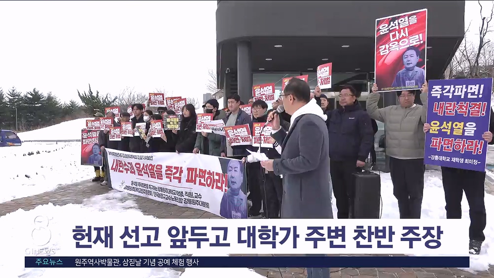 강릉원주대 일부 학생,교수들은 오늘(17일) 대학에서 기자회견을 갖고, "상상도 못한 비상계엄선포로 헌법이 유린되고 민주주의가 파괴됐다"며,