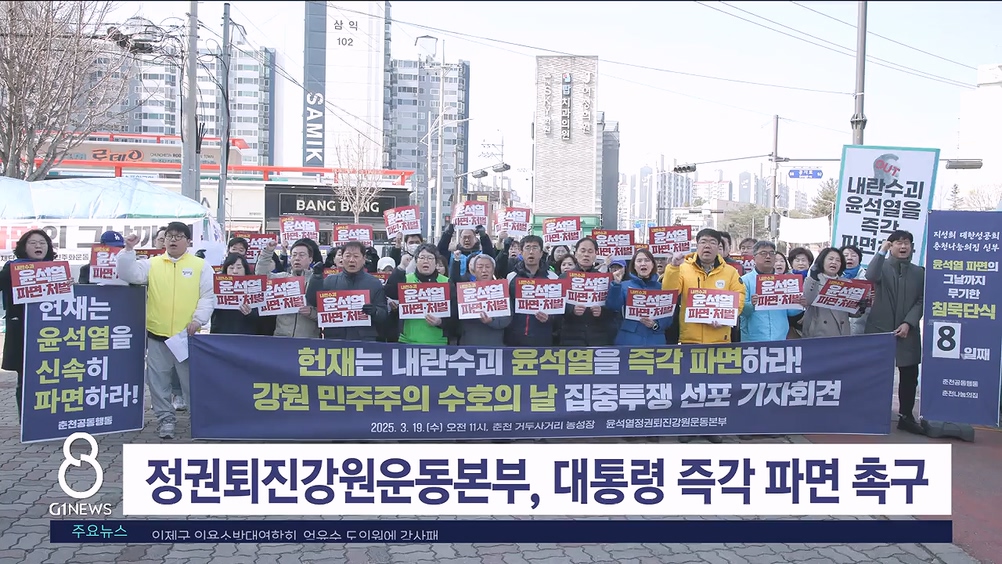 윤석열정권퇴진 강원운동본부가 오늘(19일) 춘천 거두사거리 일원에서 대통령의 즉각 파면을 촉구하는 기자회견을 열었습니다.