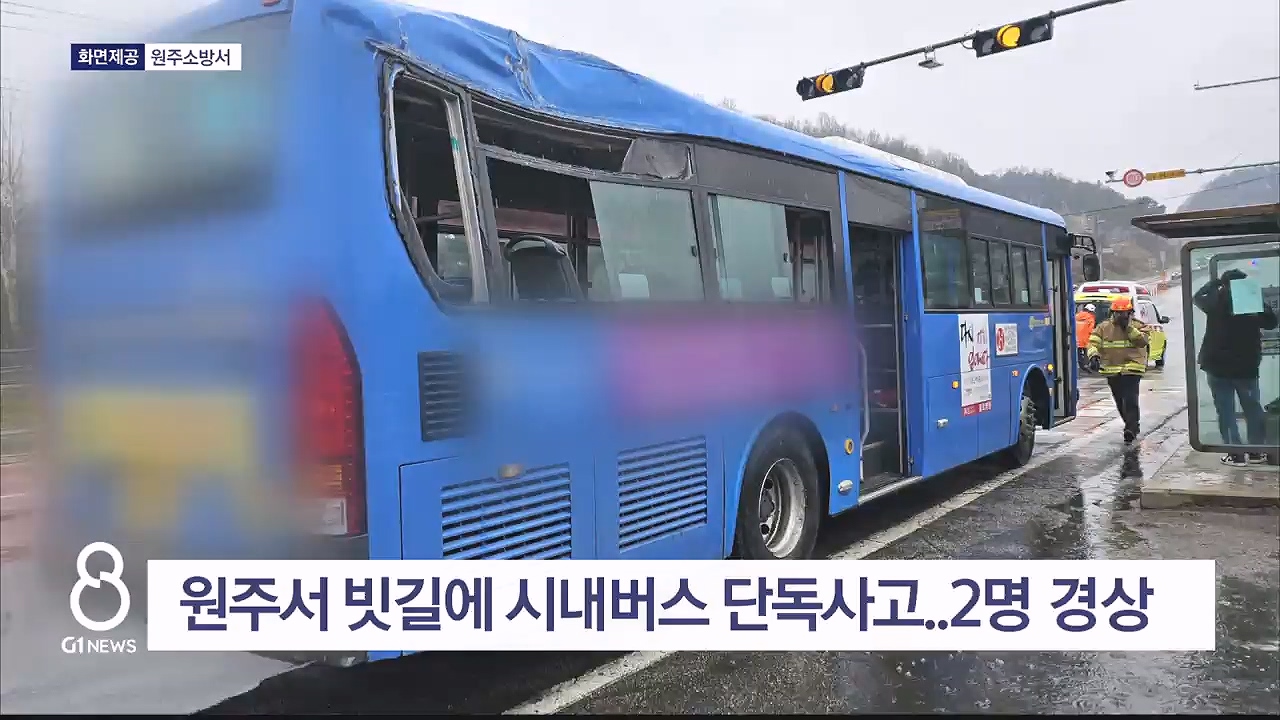원주서 빗길에 시내버스 단독사고..2명 병원 이송