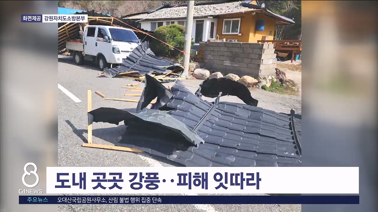 오전 9시 19분 쯤 삼척시 미로면 내미로리에서 강풍으로 주택 지붕이 파손된 것을 비롯해 나무 전도와 간판 흔들림, 낙석 등의 사고가 이어졌습니다.
