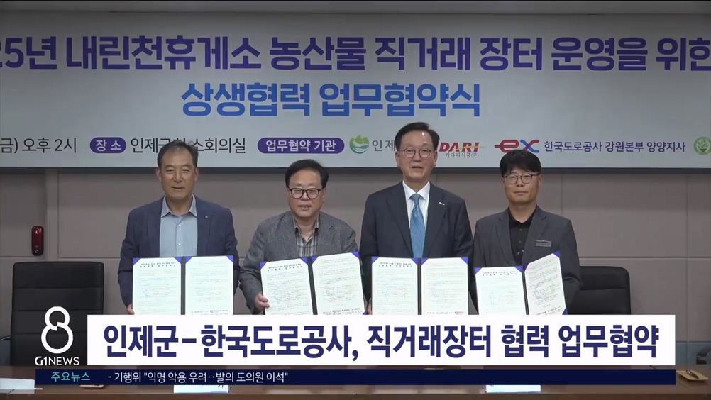 인제군이 한국도로공사 강원본부 양양지사 등과 오늘(16일) 군청에서 '내린천휴게소 농산물 직거래 장터 운영을 위한 상생 협력 업무 협약'을 체결했습니다.