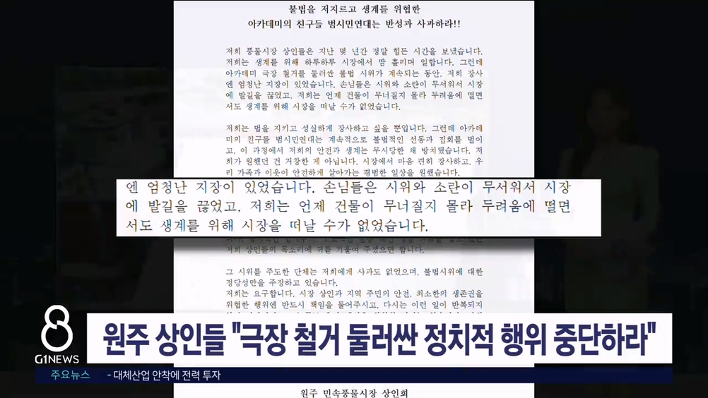 원주 민속풍물시장 상인회는 오늘(24일) 성명을 통해 "극장 철거를 둘러싼 반대 단체의 불법 점거 농성으로 상인들은 불안에 떨어야 했다"며 "선동과 집회로 인해 평범한 일상을 빼앗기고 있다"고 지적했습니다.
