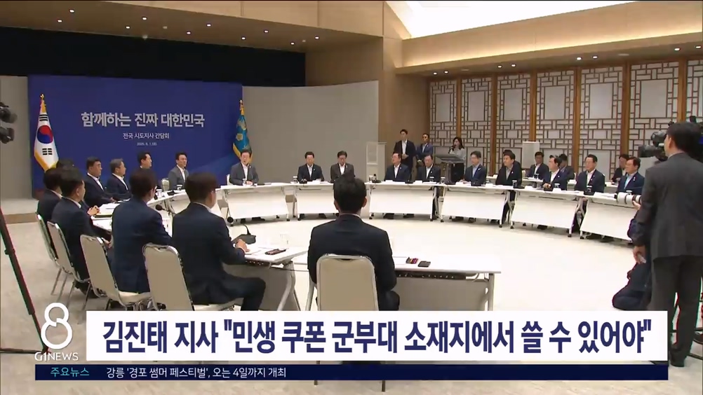 김진태 도지사는 오늘 대통령실에서 열린 전국 시도지사 간담회에 참석해 군 장병에게 지급된 민생 소비 쿠폰을 군부대 소재지에서도 쓸 수 있게 해달라고 건의했습니다.