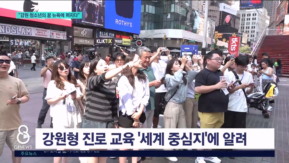 "저는 지금 뉴욕 타임스퀘어 앞에 나와 있습니다. 잠시 뒤 바로 이곳에 강원 지역 학생들의 진로 체험 활동 영상이 송출됩니다."