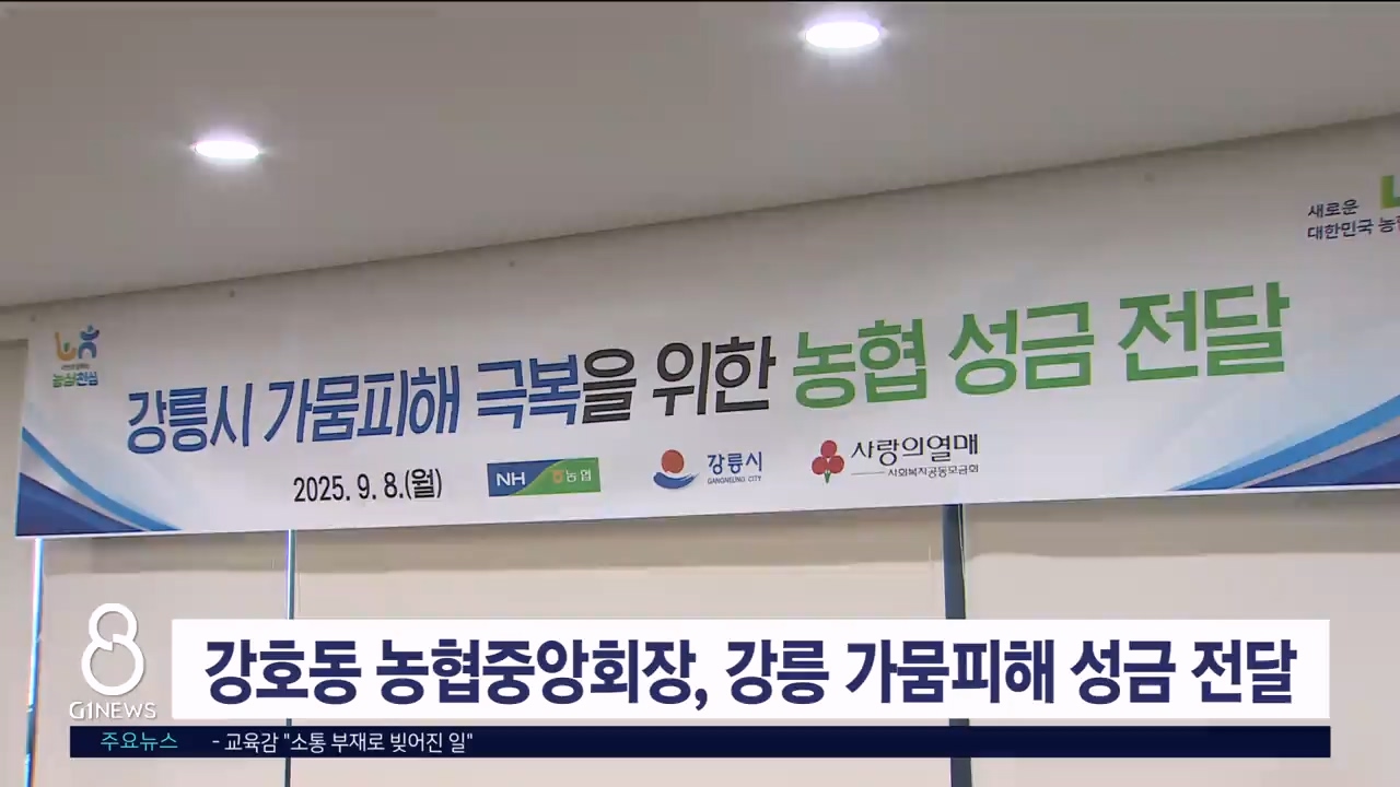 강호동 농협중앙회장이 강릉시를 찾아 가뭄 극복을 위한 성금과 물품을 전달했습니다.